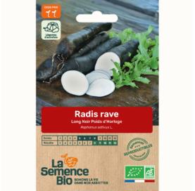 Descriptif : le radis Rave Long Noir Poids d'Horloge est une variété ancienne, caractérisée par ses racines longues, cylindriques et de couleur noire atteignant généralement 20 à 30 cm de longueur. Sa chair est blanche, ferme et croquante, son goût piquant et épicé, particulièrement apprécié en salade ou râpé. Cette variété est très appréciée pour se conserver tout l'hiver, dans un endroit frais et sec.