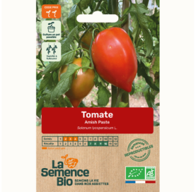 Descriptif : la tomate Amish Paste est une variété mi-précoce originaire des USA et cultivée par les Amish. Elle produit des fruits rouge orangé de 120 à 240 g à chair rouge charnue et juteuse avec peu de graines. De type Roma, elle est connue pour son utilisation en coulis mais se sert aussi bien en salade.