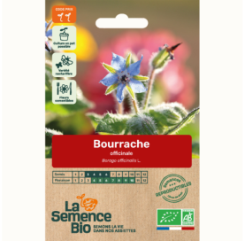 Descriptif : la bourrache officinale présente des grappes de fleurs bleu lumineux. Ses fleurs et feuilles au goût de concombre sont comestibles fraîches, à consommer crues ou cuites.