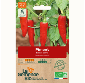 3,30 €Descriptif : le piment Gorria, originaire du Pays Basque, est une variété très productive au goût moins piquant que d’autres piments type Cayenne. Ce piment produit jusqu’à 15 fruits par pied, de couleur rouge et de forme conique de 10 à 14 cm de long. Echelle de Scoville : Force 4.