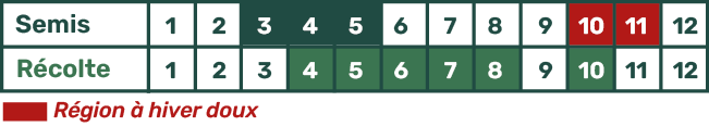 Semis : à une profondeur égale à la taille de la graine, soit 1 cm, en godet pour un semis sous abri ou directement au potager dès que les risques de gelées sont écartés.