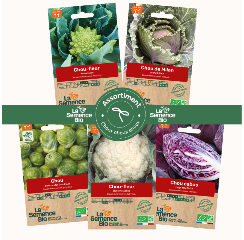 Descriptif : Explorez toute la richesse de la famille des choux avec ce pack de variétés complémentaires, alliant formes, textures et saveurs. Du chou de Bruxelles Groninger, savoureux et rustique, au chou de Milan de Port-Neuf aux feuilles tendres, en passant par le chou-fleur blanc Marzatico, le graphique chou romanesco et le chou rouge Tête Noire n°3 à la saveur douce, cet assortiment offre une belle diversité pour la cuisine d’automne et d’hiver.