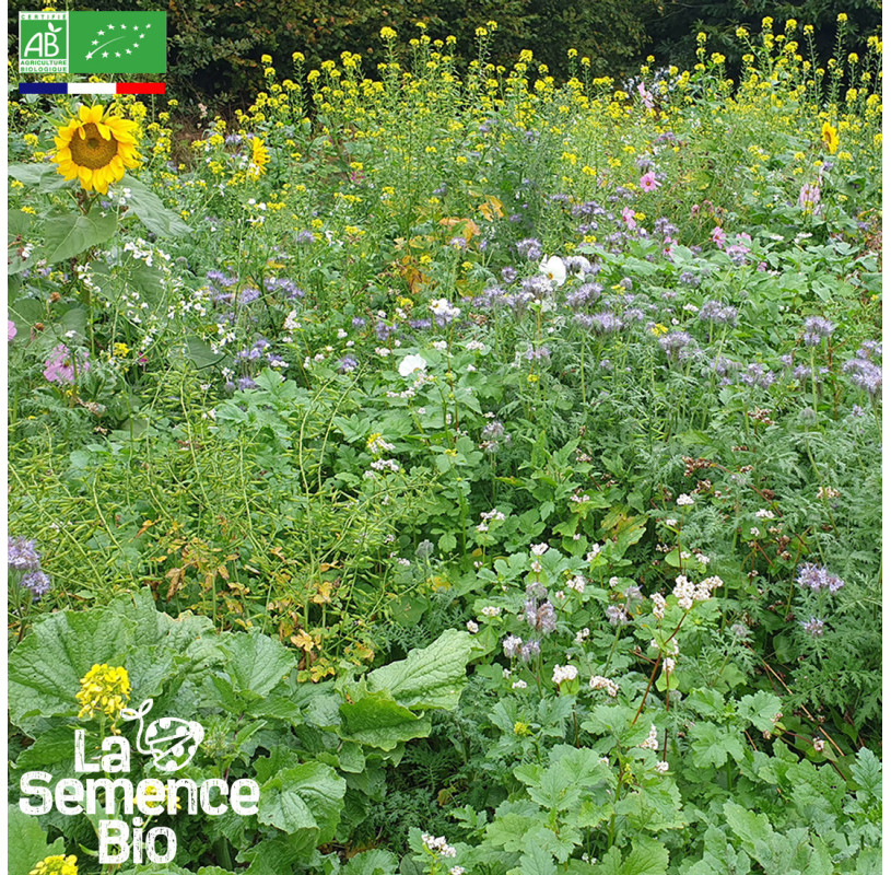 Nom latin : Phacelia tanacetifolia, Fagopyrum esculentum, Sinapis alba, Coriandrum sativum, Nigella damascena, Calendula officinalis, Centaurea cyanus, Raphanus sativus, Malva sylvestris, Anethum graveolens, Helianthus annuus, Ornithopus sativus,