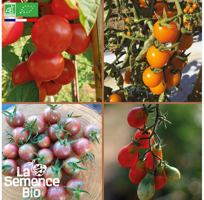 Descriptif : Ce mélange de 4 variétés de tomates cerises de 10 à 30 g est un mix de formes et de saveurs, idéal pour surprendre vos papilles lors d'un apéritif estival ou pour accompagner vos salades. Du jaune au noir en passant par le rouge vif, ces tomates embelliront aussi bien vos assiettes que votre coin potager. (tomates Gold Nugget, Délice des jardiniers, Red Pearshaped, Black Cherry)